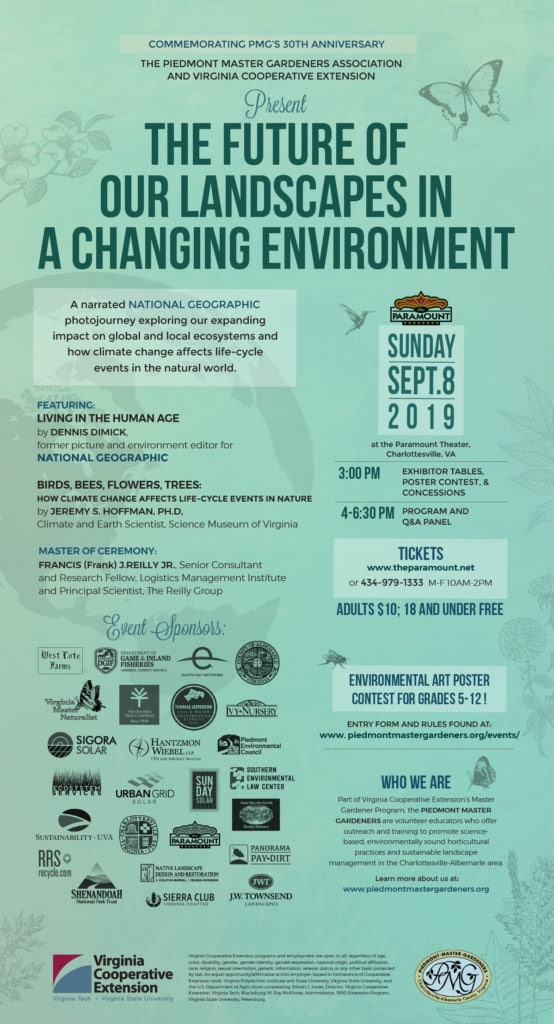 The Piedmont Master Gardeners are hosting a climate awareness/environmental sustainability education event at the Paramount Theater on Sunday, Sept. 8, 2019, with two great speakers: