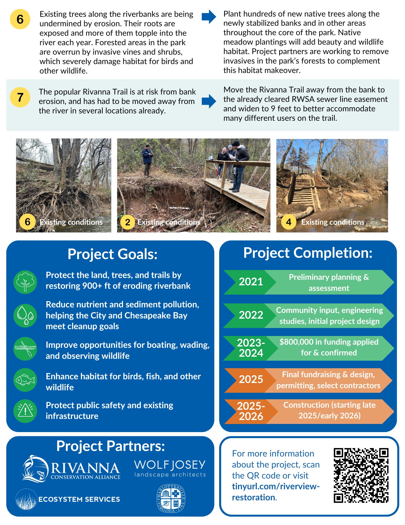 The goal of the Rivanna Restoration at Riverview Park project is to use appropriate natural stream and landscape restoration approaches to address these problems. The project will restore more than 900 feet of eroding riverbank starting just below the stormwater outfall channel and extending upriver to the first powerline cut. The project will also fill in and stabilize the rapidly degrading stormwater channel pictured above. Additionally, the project will add several new river access areas, protect the Rivanna trail and add new trails, create new river viewing areas, restore native habitats through tree and meadow plantings, and more.