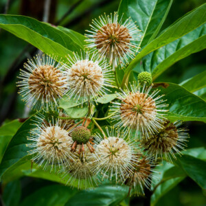 The common name for buttonbush, or Cephalanthus occidentalis, is honeybell, and it can grow 6 to 8 feet wide and up to 15 feet tall. It has a brownish green stem, green leaves, and small white flowers that bloom in the summer. It lives in wetland areas with plenty of water, and especially thrives in peat moss soil. Button bushes help restore wetlands and create wildlife habitat, and prevent erosion from flooding. Native people sometimes used the button bushes for medicine. It has unique looking flowers, and it produces fruits that last into the winter, providing an important food source for animals like pollinators and birds.