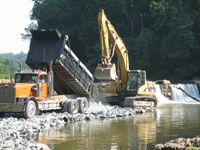 After a formal bidding process, the Rivanna Conservation Society awarded the demolition contract to the lowest bidder: Shelbeck Excavation of Scottsville, VA. Isaac Shelley and his crew (JJ, Thomas, and Billy) took advantage of the low water caused by the summer drought and in early August built a ramp and causeway from the private driveway of Security Storage Allied Van Lines at the end of E. Market Street. This causeway went down into the river and allowed for the transport of the heavy equipment necessary to complete the demolition. Rivanna Conservation Society Committee members, including engineer Pat Punch, were on site almost every day to monitor and guide the work. The Shelbeck track hoe operator (JJ) did an outstanding job of removing the blocks of cut stone, one by one. This careful process ensured the gradual release of the impounded water. With precision, each course of block was removed, allowing water to spill over the lowered dam, causing the impoundment behind the dam to fall, foot by foot.